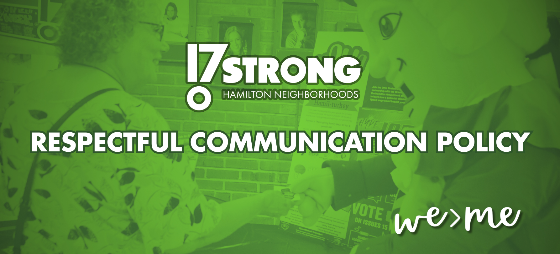 Presenters are giving their time and sharing their lived experiences as volunteers. If you disagree with something said, do not confront them during or after the session. Instead, speak with a 17STRONG Board Member or City of Hamilton Neighborhood Services Team member to continue the conversation respectfully.